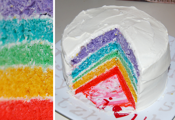 I have been baking up a storm this month! First, I made this mini-cake for Mother’s Day. Then this week I baked an awesome rainbow cake for a fundraiser cake auction and a Mickey Mouse Clubhouse birthday cake for a friend. The rainbow cake was fun!