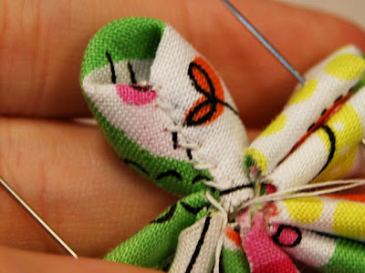 Step 3. Double thread a needle and string all of the petals at the same point, so they’ll all be the same size. Next, clip off the excess fabric at the corners like in the photo.