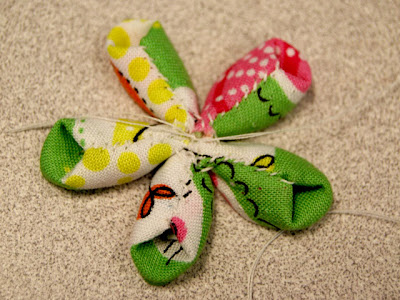 When you reach the bottom of the petal, send the needle up through the next one and continue until all of the petals have been sewn. You can then tie a knot. (But don’t cut the thread yet, you’ll still need it)