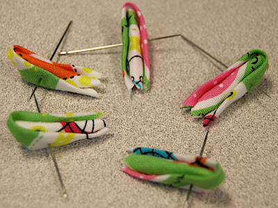 Finally, you fold the petal in half and stick a pin through it so it will hold it’s shape. Do this for all 6 fabric squares.