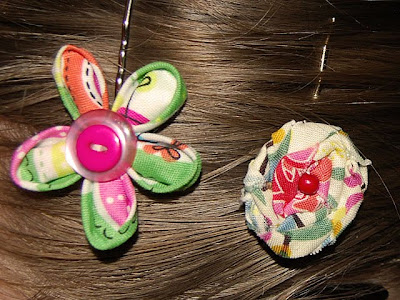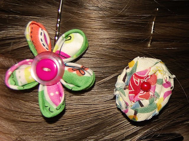 Step 6. Use the extra thread to sew a button to the front of the flower and you’re done! (I sewed two buttons on because I like the way it looked, have fun with it!) I have a bunch of those bobby pins that have a round metal base, they’re great for making these flowers into cute hair accessories. (And here is the finished twist rose from my last tutorial.)