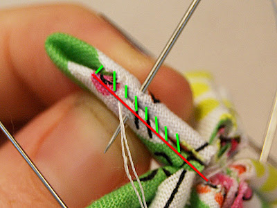 You’re going to send the needle up through the folded edge of the back of the petal. (The red line in the photo) And then do a few quick, simple stitches all the way down the seam. (The green lines in the photo) After I do the first stitch in this step is when I like to remove the needle from the petal I’m working on.