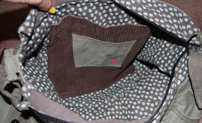 The inside is lined with the fabric from a knitted woman’s top. And the pocket on the inside is brown corduroy from an old pair of pants of mine. (I’ve used that corduroy in several projects so far!)