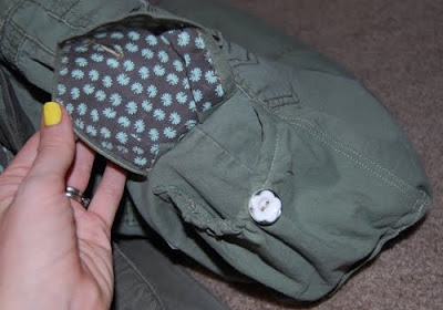 I made two extra pockets on the outside. The smaller one closes with a button, for pacifiers or whatever ends up in it. And the second pocket is made from the sleeve of the shirt I lined the inside with, and will be great for holding a bottle.