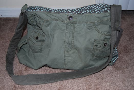 When I started learning to sew, I got a request from my sister (who is preggo with girlie #3) for a diaper bag made from recycled materials. Sounded like a fun project to me! I am fairly happy with the outcome. It definitely looks handmade! Which I guess is a good thing, right? It’s made with love