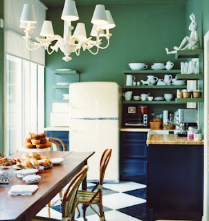 So if you take the steel pieces from the first photo and replace them with some crazy bright colored cabinets, we’re getting closer to my dream kitchen! I love the chandelier, but I would like a white one better. Like this: