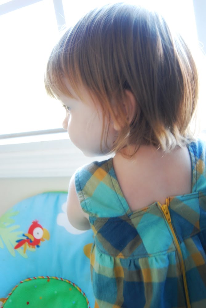 I’ve had this shirt forever, and it’s been so hard for me to figure out the perfect use for it. But I had a moment of inspiration the other night and finally just started sewing. I just made it up as I went along, and I love how it turned out! Of course, now I know a lot more about how this type of dress goes together, and next time I’ll do a few things different. But Juniper likes her new dress so whose to argue?