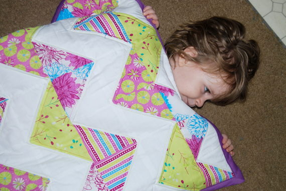 The first one I made I think I got a little overzealous… I did a zigzag pattern with some fat quarter fabric I’ve had in my stash for ages. It took me forever to figure out the pattern and get it all sewn together. But it’s my first quilt ever! I was so excited as it came together. You can’t tell in the photos, but I used colorful thread for the quilting so it gave it some color on the back.