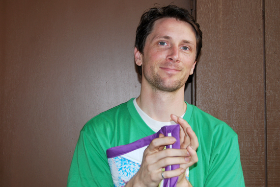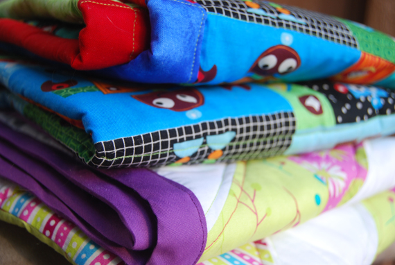 The first one I made I think I got a little overzealous… I did a zigzag pattern with some fat quarter fabric I’ve had in my stash for ages. It took me forever to figure out the pattern and get it all sewn together. But it’s my first quilt ever! I was so excited as it came together. You can’t tell in the photos, but I used colorful thread for the quilting so it gave it some color on the back.